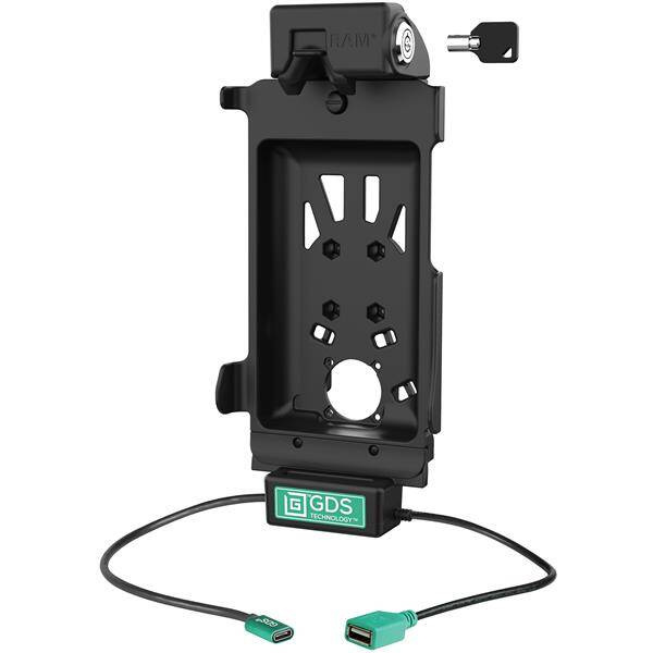 - Stația de andocare pentru vehicule cu blocare prin cheie, cu arc și tehnologie GDS® Technology™, utilizează un conector cu pini pogo integrat pentru a asigura încărcarea și conectarea la un periferic USB suplimentar