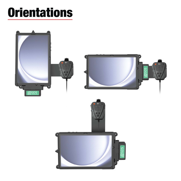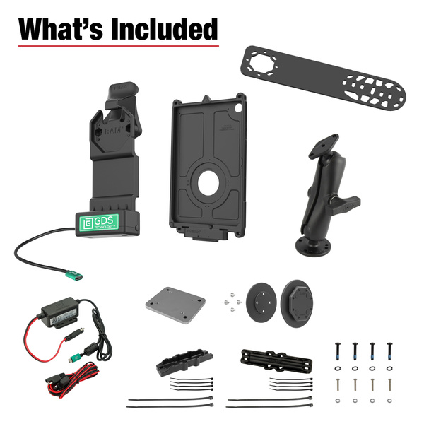 - Bundle includes GDS® Uni-Conn™ dock, Uni-Conn™ adapter, IntelliSkin® for the Samsung Tab A9+, a microphone bracket, hardwire charger, and a double ball mount with backing plate