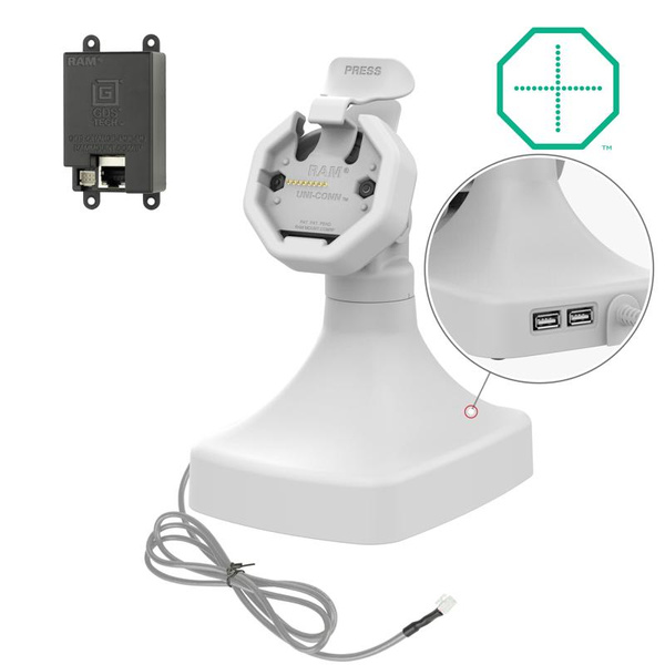 GDS Uni-Conn Powered Tilt & Swivel Dock with PoE + Data - Gray (RAM-GDS-DOCK-D14-U3E-2A-GRY) este un dock de sine stătător, alimentat pentru dispozitive incluse într-o IntelliSkin Thin-Case cu Pogo Pads spate. Această soluție poate pivota la 180 de grade și permite dispozitivelor să se încline la 180 de grade, fiind ideală pentru industriile centrate pe client, cum ar fi comerțul cu amănuntul, ospitalitatea, serviciile alimentare și multe altele. Conectați și deconectați cu ușurință dispozitivul cu ajutorul mecanismului mecanic de fixare. Alimentarea prin Ethernet (PoE) este furnizată pinilor pogo integrați în adaptorul GDS Uni-Conn prin intermediul conexiunii RJ45, în timp ce cele două porturi USB-A de pe spate acceptă până la două dispozitive de intrare, cum ar fi tastatura, mouse-ul, pistolul scanerului și altele. Acest dock are o bază cu greutate și tampoane de cauciuc care oferă descurajare la furt și îl împiedică să alunece pe suprafețe. Estetica gri deschis este ideală pentru locurile de muncă sofisticate și luminoase. Un dock pentru a le conecta pe toate Întotdeauna protejat. Mereu conectat. MarcăSimbolRAM-GDS-DOCK-D14-U3E-2A-GRYCod producător793442024016SeriaHardware inclus(1) RAM® PoE to PD Charging ModuleDimensiunile produsuluiHeight from Base to Tilt Bolt: 5.52"|Base Width: 5.13"|Base Depth: 6.63"Tip de ambalajCutieTensiunea de ieșireUSB PD 3.0:|5V @ 3A|9V @ 2.2A|12V @ 1.7AUSB PD 3.0:|5V @ 3A|9V @ 2.2A|12V @ 1.67APD 3.0: 5V @ 3A 9V @ 2.22A 12V @ 1.67APutere de ieșire24W Max20W MaxConector de intrareJST Male ConnectorLungimea cablului de intrare1.5 MetersPorturi(2) USB-APărți componenteRAM-GDS-CHARGE-POE-PDUGreutatea produsului2740 gViteza de transfer10/100MbpsSpecificații de putereRequired Input: POE+ (802.3at) or greater - Produse recomandate