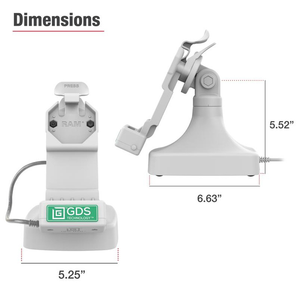 Dock-ul GDS Uni-Conn Tilt & Swivel cu PoE - Gri (RAM-GDS-DOCK-D14-U1E-GRY) este un dock autonom, alimentat cu energie electrică pentru dispozitivele incluse într-un IntelliSkin Next Gen, IntelliSkin Hard Case sau IntelliSkin Thin-Case standard cu un adaptor GDS Uni-Conn. Această soluție poate pivota la 180 de grade și permite dispozitivelor să se încline la 180 de grade, ceea ce este ideal pentru industriile centrate pe client, cum ar fi comerțul cu amănuntul, ospitalitatea, serviciile alimentare și multe altele. Alimentarea prin Ethernet (PoE) este furnizată la pinii pogo integrați în dock-ul GDS Uni-Conn prin intermediul conexiunii RJ45. Acest dock are o bază cu greutate și tampoane de cauciuc care oferă descurajare la furt și îl împiedică să alunece pe suprafețe. Estetica gri deschis este ideală pentru locurile de muncă sofisticate și luminoase. Un dock pentru a le conecta pe toate Întotdeauna protejat. Întotdeauna conectat. MarcăSimbolRAM-GDS-DOCK-D14-U1E-GRYCod producător793442023835SeriaHardware inclus(1) RAM® PoE to PD Charging ModuleDimensiunile produsuluiHeight from Base to Tilt Bolt: 5.52"|Base Width: 5.13"|Base Depth: 6.63"Tip de ambalajCutieTensiunea de ieșireUSB PD 3.0:|5V @ 3A|9V @ 2.2A|12V @ 1.7AUSB PD 3.0:|5V @ 3A|9V @ 2.2A|12V @ 1.67APD 3.0: 5V @ 3A 9V @ 2.22A 12V @ 1.67APutere de ieșire24W Max20W MaxConector de intrareJST Male ConnectorLungimea cablului de intrare1.5 MetersPărți componenteRAM-GDS-CHARGE-POE-PDUGreutatea produsului2781 gViteza de transfer10/100MbpsSpecificații de putereRequired Input: POE+ (802.3at) or greater - Produse recomandate