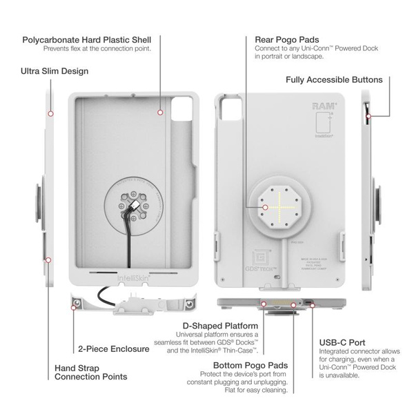 - Two-piece, hard plastic enclosure for Apple iPad Pro 11" (M4) with dual integrated GDS® connector—rear pogo pads and Dinstinctive D Shape pogo pads