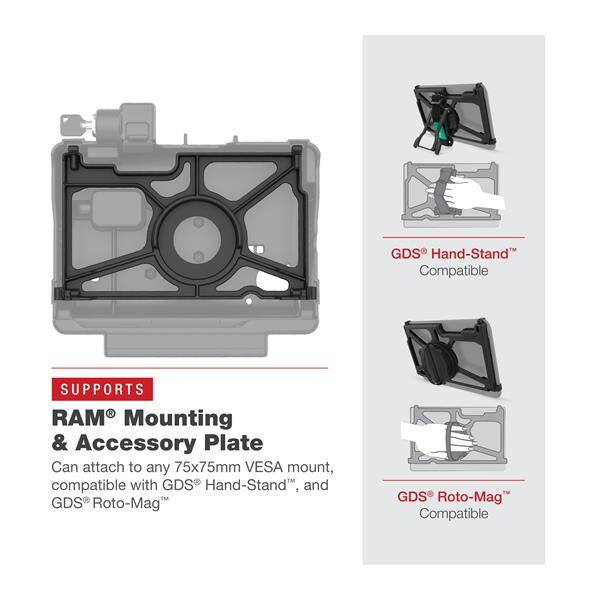 - Compatibil cu RAM® AMPS cu 4 găuri și baze cu model VESA de 75 mm x 75 mm pentru atașarea unui braț cu priză dublă; tehnologia cu bilă și priză permite o ajustabilitate aproape infinită