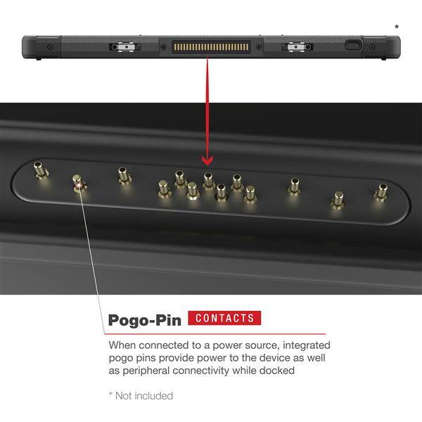 - Dock-ul alimentat cu arc, cu blocare prin cheie, oferă capacități de încărcare pentru tableta Panasonic FZ-A3 prin mufa de alimentare DC de 5,5 mm