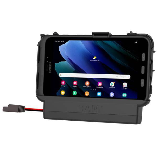 - RAM® EZ-Roll'r™ Powered form-fit dock oferă capacități de încărcare pentru Samsung Galaxy Tab Active3 și Tab Active2 prin conectorul cu pini pogo integrat și încărcătorul hardwire încorporat.