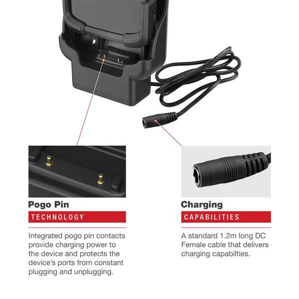 - Dockul cu arc de fixare fixează perfect PC-ul portabil Zebra TC73 și TC78; furnizează alimentare prin intermediul unui conector DC lung de 1,25 metri