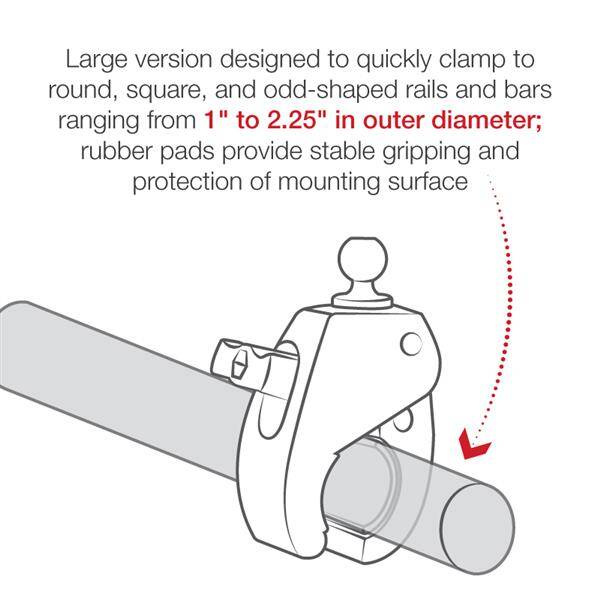 - Versiune mare proiectată pentru a fixa rapid șinele și barele rotunde, pătrate și de formă ciudată, cu diametrul exterior de la 1" la 2,25"; tampoanele de cauciuc asigură o prindere stabilă și protecția suprafeței de montare